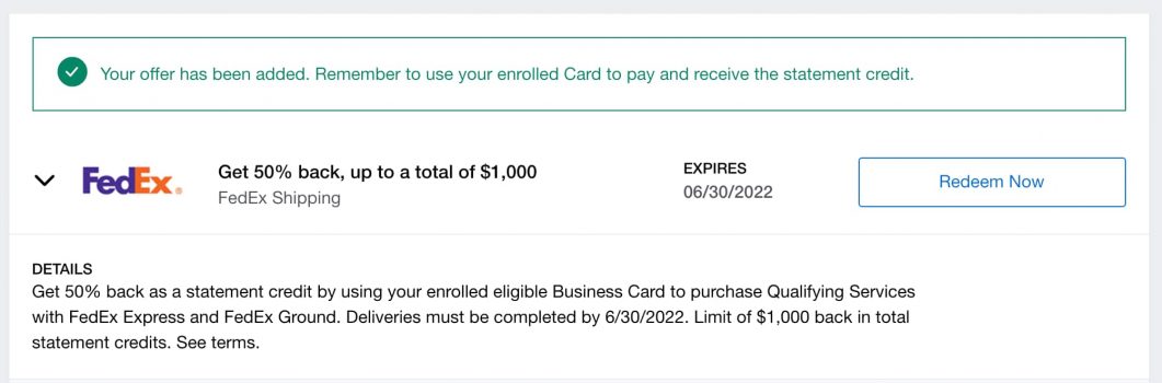 Amex Provide 50% again on fedex, as much as $1000 again