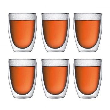 Bodum [bodum.com] has 6 pcs Bistro Mug, Double Wall Glass, 0.3 l, 10 oz $43.19