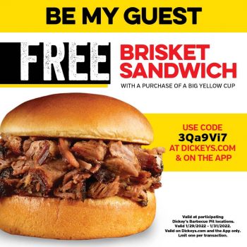 Select Dickey’s Barbeque Pit Locations [dickeys.com] provides: Free Brisket Sandwich w/ Purchase of Big Yellow Cup Drink with costs ranging from $2.75 once you apply coupon code 3Qa9Vi7
