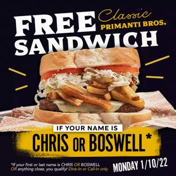 Anyone with the title Chris* or Boswell will get a FREE Classic Primanti Bros. Sandwich Today!