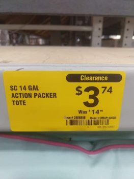 My native lowes had Rubbermaid Medium 14-Gallon (56-Quart) Black/Grey/Red Tote with Latching Lid on Clearance for $3.74.